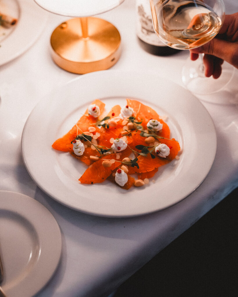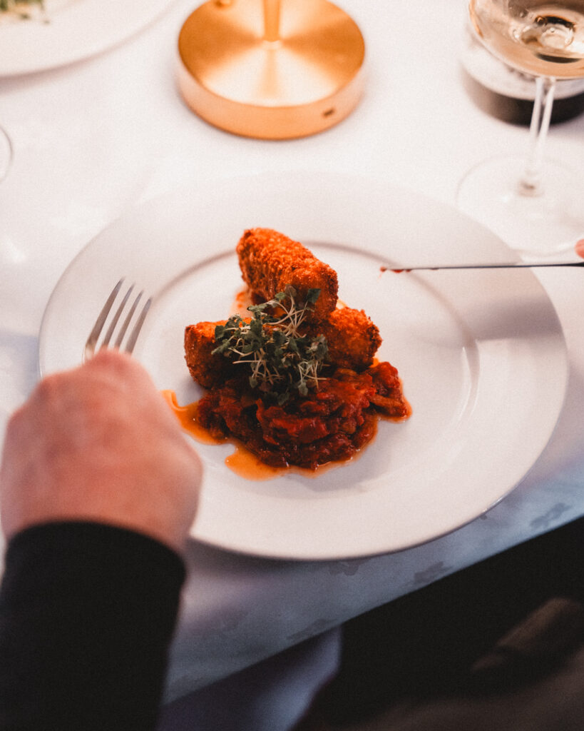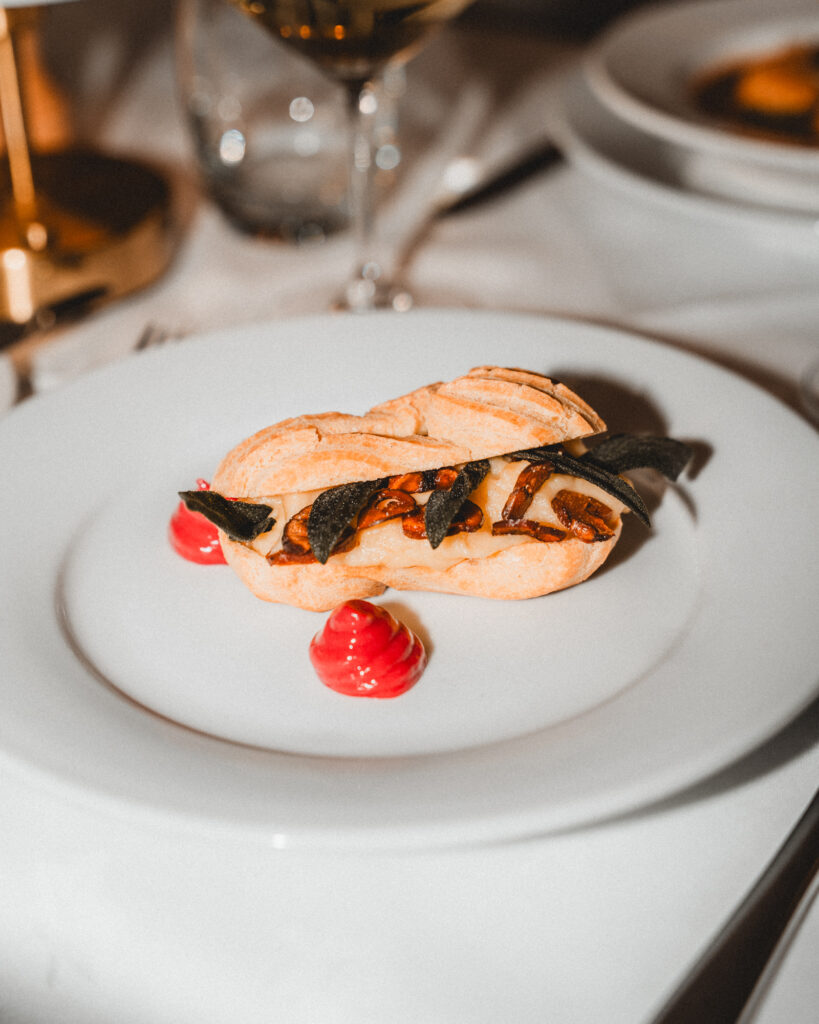 The winter menu opens with a selection of starters that balance comfort with creativity. Our Parsnip Éclairs are a standout, filled with smooth parsnip cream and finished with redcurrant gel, chestnut and sage, a dish that feels unmistakably seasonal and quietly indulgent.