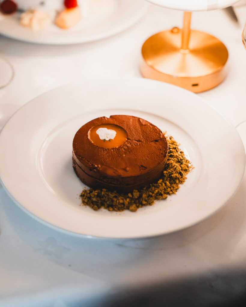 Winter calls for proper puddings, and this menu delivers. The Dark Chocolate Marquise is rich and indulgent, served with pistachio and a sharp kumquat compote to cut through the sweetness.